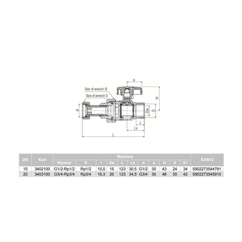 Kurek kulowy do gazu z gwintem Z-Z, DN3/4”, Art. 3033, 64/8