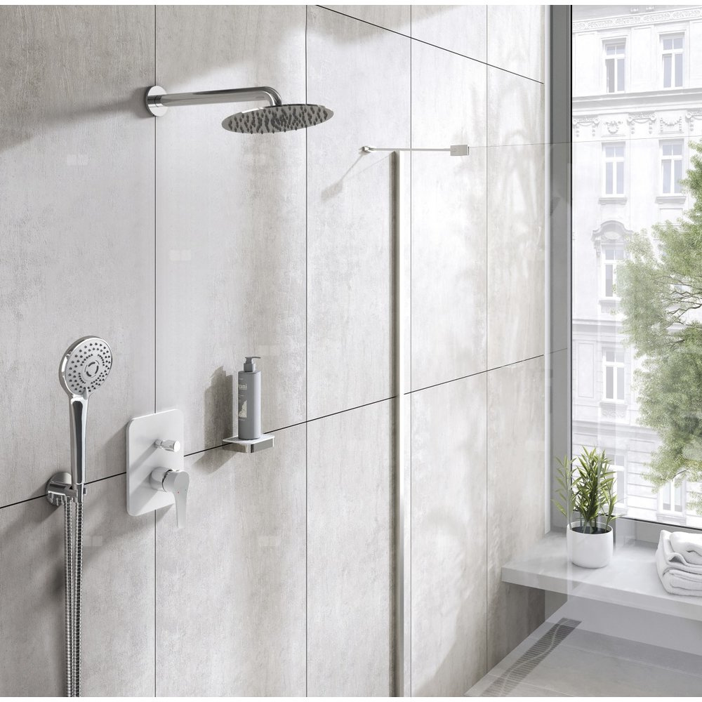 Bateria natryskowa podtynkowa w oryginalnym dwukolorowym wykończeniu idealnie pasującym do nowoczesnych wnętrz. Produkt umożliwia obsługę dwóch różnych odbiorników wody (np. deszczownicy, rączki natryskowej). Co daje nam możliwość swobodnej konfiguracji całego zestawu.
