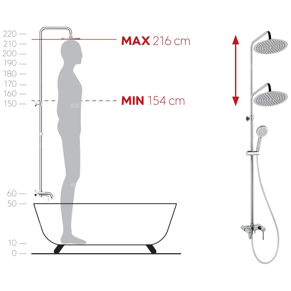 Zestaw natryskowy FIESTA to produkt, który łączy baterię wannową, kolumnę natryskową i natrysk przesuwny. Niezwykle eleganckie rozwiązanie dla ceniących sobie znakomity wygląd oraz dopracowane detale we wnętrzu. Płaska, metalowa deszczownia SLIM o średnicy 25 cm, 3-funkcyjna rączka natrysku w kolorze chromu i dopasowany do całości wąż o długości 150 cm to główne walory przemawiające za wyborem właśnie tego produktu do łazienki. Zestaw FIESTA posiada regulowaną wysokość deszczowni, aż do 206 cm od dna wan
