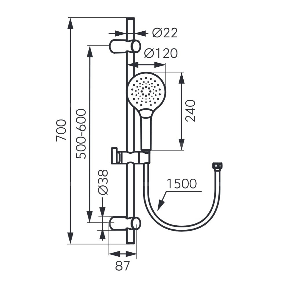 Zestaw natryskowy składający się z wielofunkcyjnej rączki z przełącznikiem typu "click". Elastycznego węża PVC z końcówka Anti-Twist zapobiegającą jego skręcaniu oraz drążka z regulowanymi uchwytami montażowymi, dzięki którym dopasujemy natrysk do istniejących otworów montażowych.