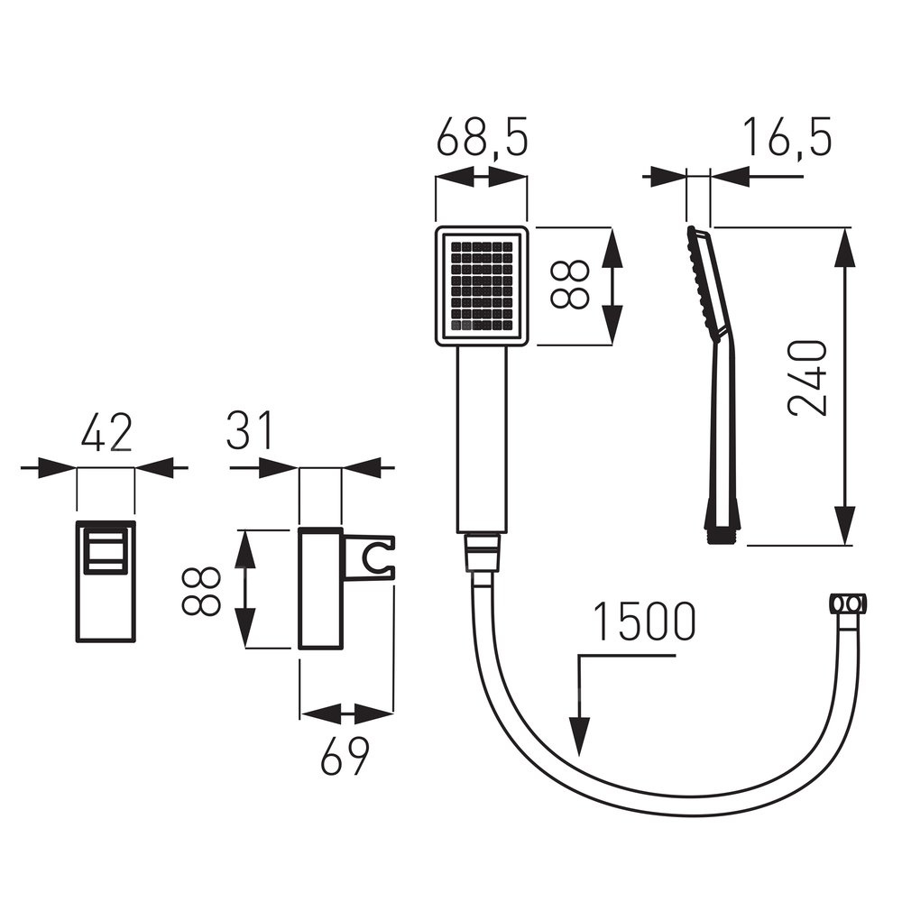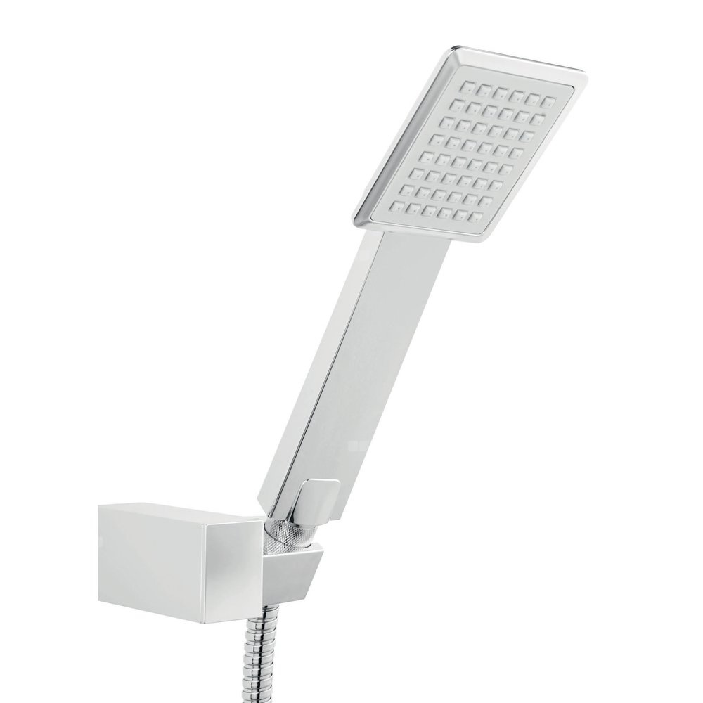 Zestaw składający się z kwadratowej, modnej rączki natryskowej z funkcją strumienia typu deszcz, dobranego stylistycznie uchwytu z regulacją kąta oraz węża natryskowego. System Easy Clean ułatwi usuwanie osadu wapiennego z rącz