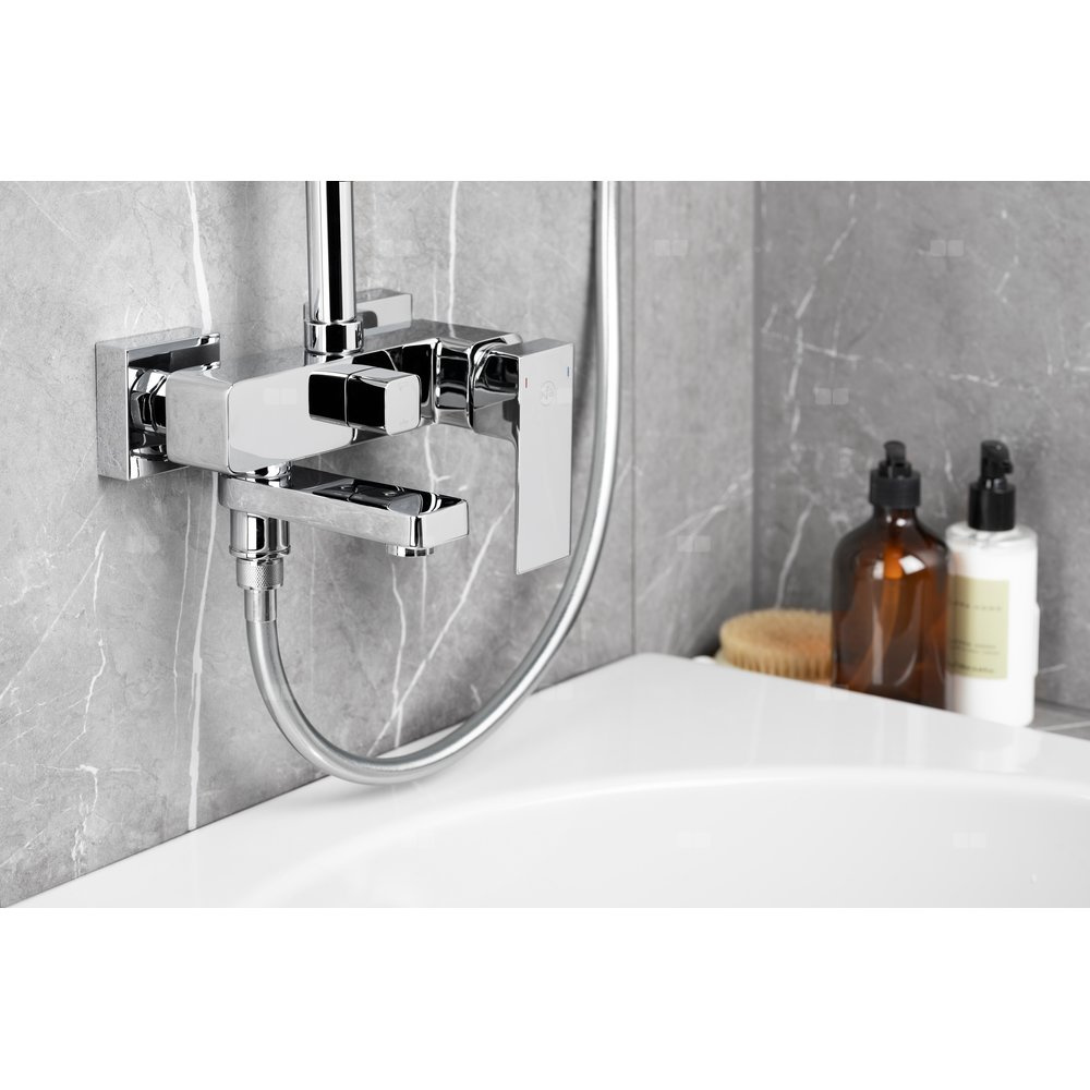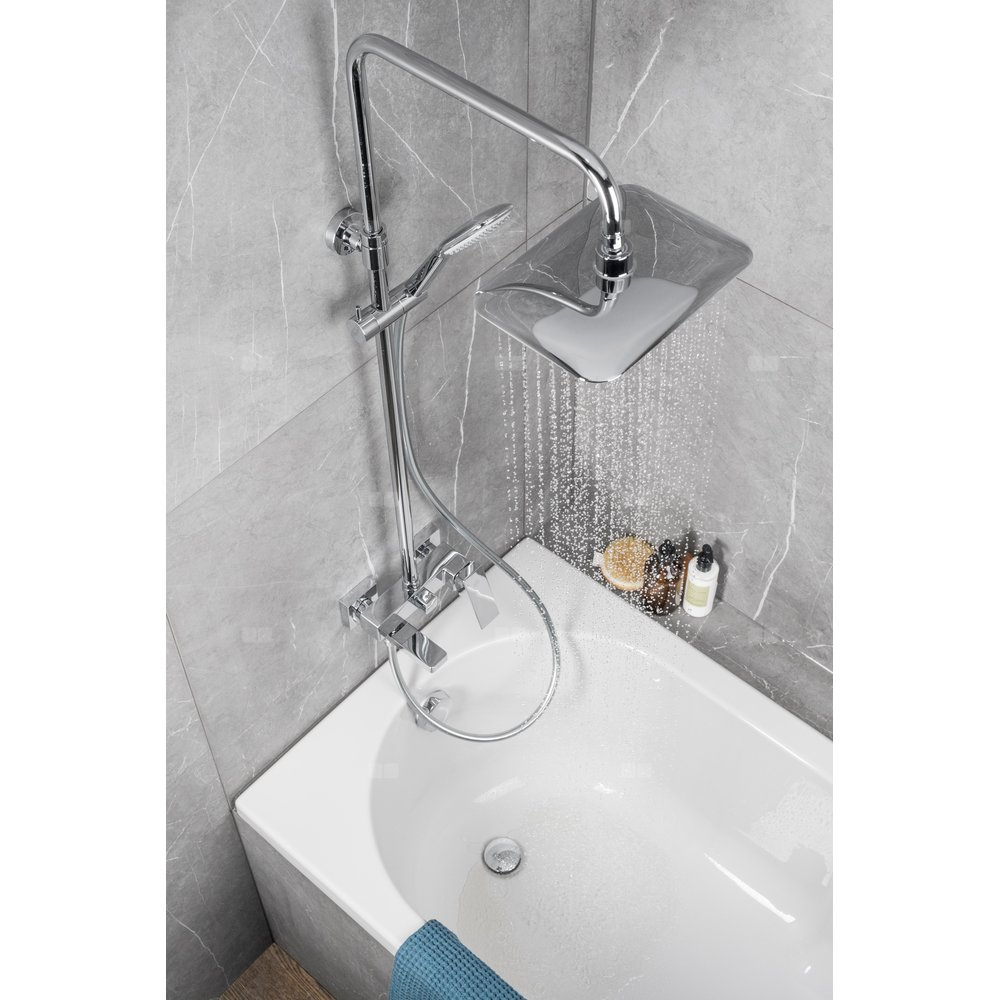Warto zwrócić uwagę na kształty w deszczowni – prostokątny dysk kolekcji Logon to optymalny rozkład strumienia wody nad wanną, a przełącznik natrysku jest ergonomiczny, bo dzięki kubicznej formie nie ślizga się w mokrej dłoni.