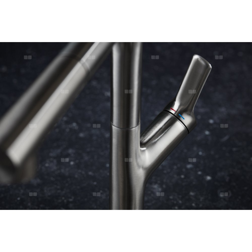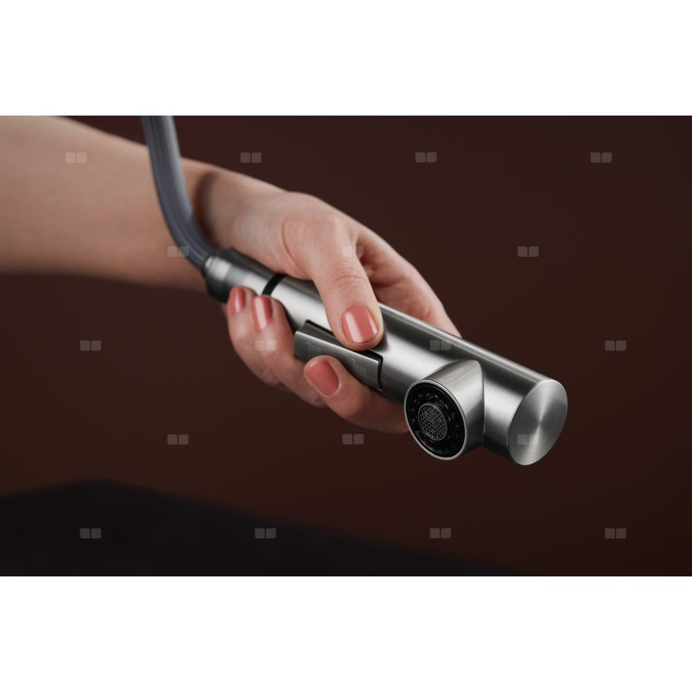 Bateria zlewozmywakowa stojąca KFA Armatura DUERO DESIGN, kolor inox, wyciągana wylewka i obrotowa wylewka 2 funkcyjna, obrotowy górny, wys. 320 mm