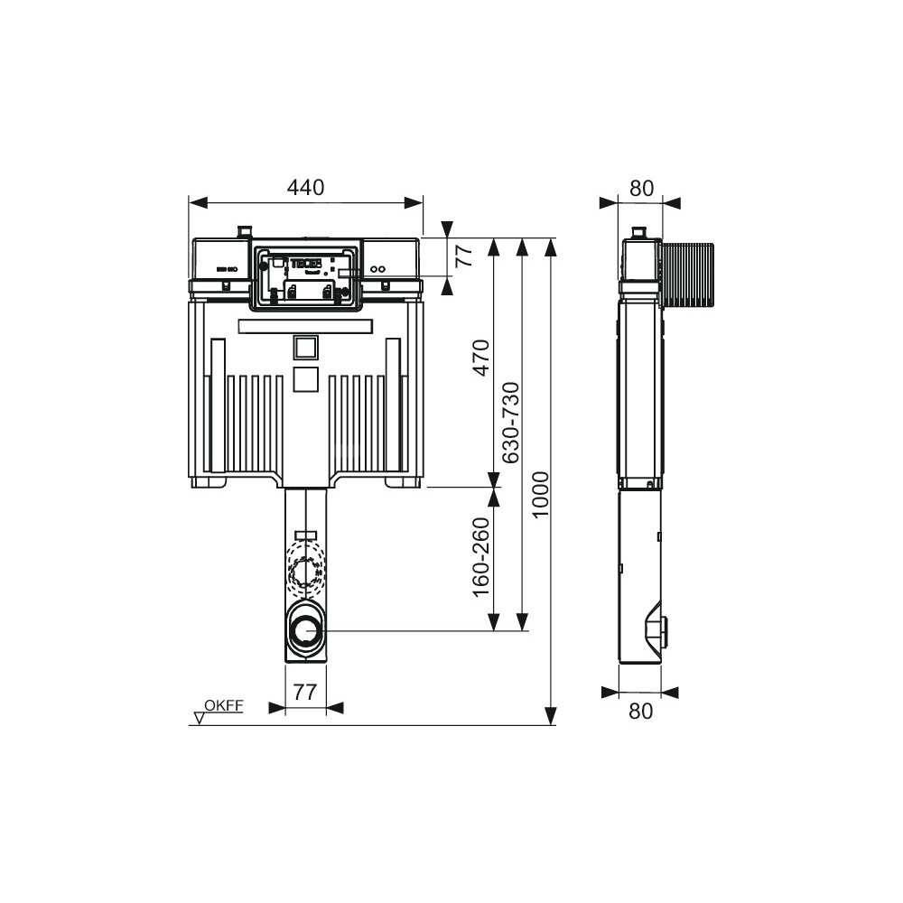 Spłuczka Octa II z instalacją przycisków spłukujących „easy fit” do toalety stojącej, głębokość 8 cm, do montażu w ścianie lub przed ścianą jednolitą.