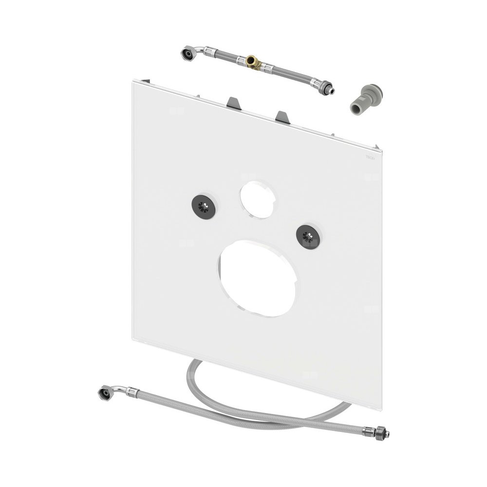 Dolna obudowa szklana do łączenia z toaletą myjącą Duravit SensoWash C oraz Slim lub V & B ViClean L, w tym samoprzylepna taśma wygłuszająca, wymienny długi wąż przyłączeniowy do spłuczki oraz adapter z tworzywa 3/8" do zaworu napełniającego F 10.