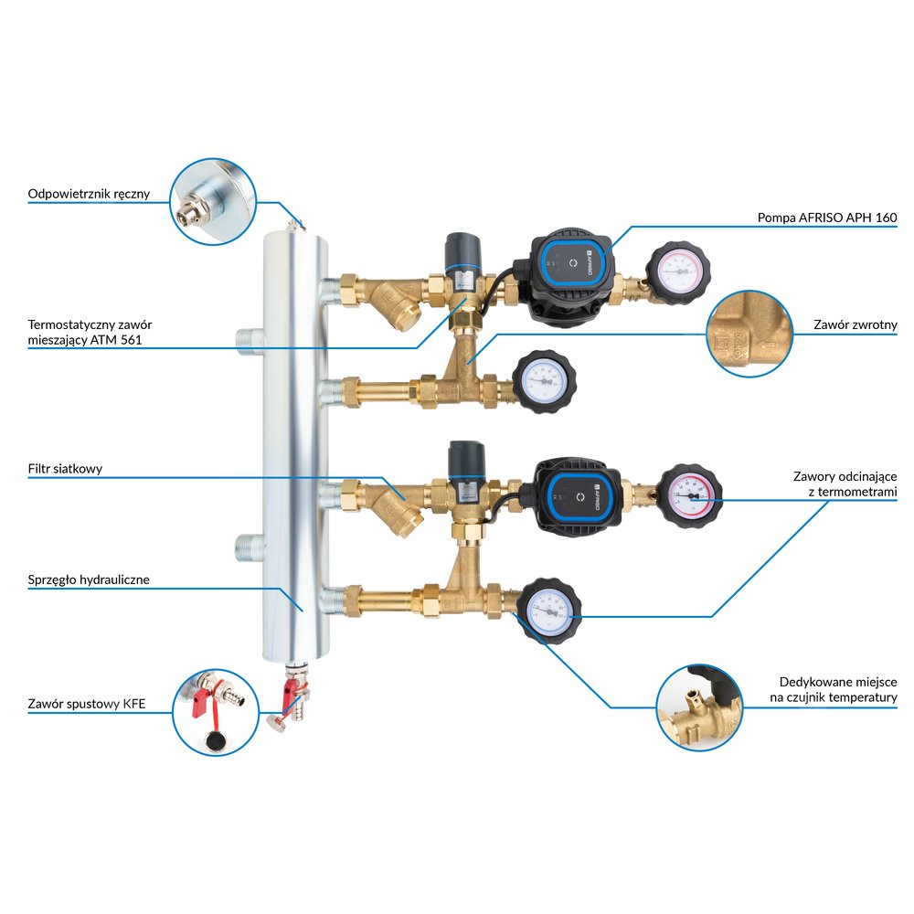 Termostatyczne zawory mieszające ATM 561 (Kvs 2,5 m³/h) z zakresem regulacji temperatury zasilania 20-43°C.