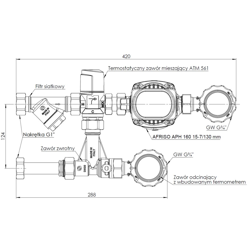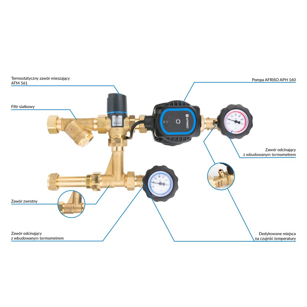 Grupa pompowa AFRISO BPS 991 AP nakrętka x GW 1'' x 3/4'', z zaworem mieszającym, z zaworem termostatycznym, z pompą obiegową AFRISO APH 160 15-7/130 mm