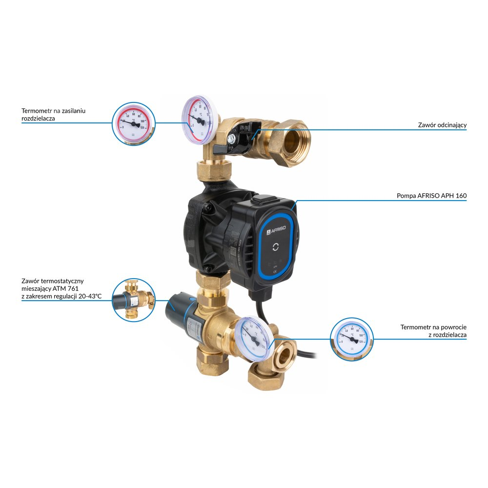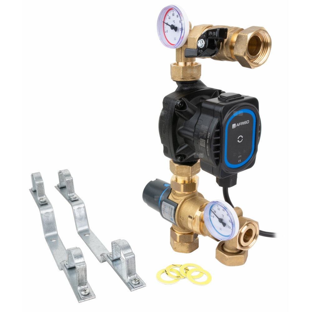 Grupa pompowa AFRISO BTU 502 AP nakrętka x nakrętka 1'' x 1'', z zaworem termostatycznym, z pompą obiegową AFRISO APH 160 15-7/130 mm