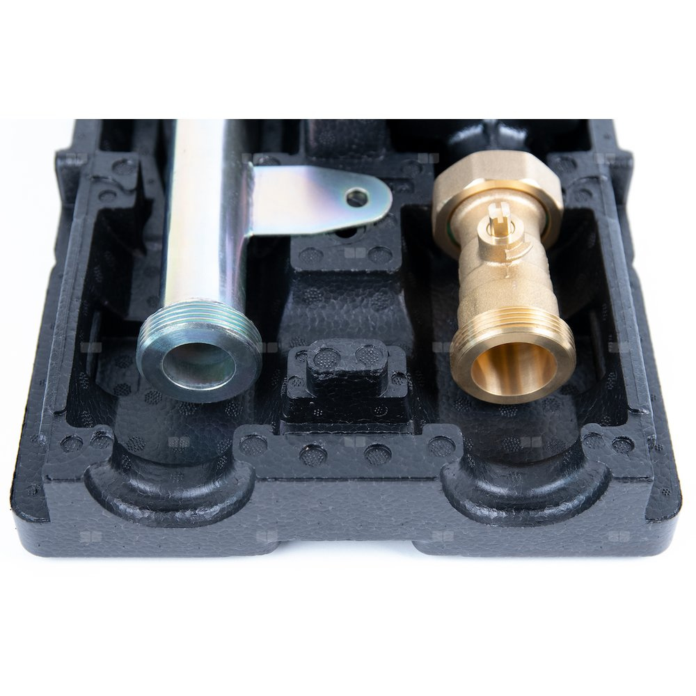 Wyposażona w niezbędne komponenty: termometry, zawór zwrotny, zawory odcinające na zasilaniu i powrocie, zawór odcinający przed pompą i izolację termiczną.