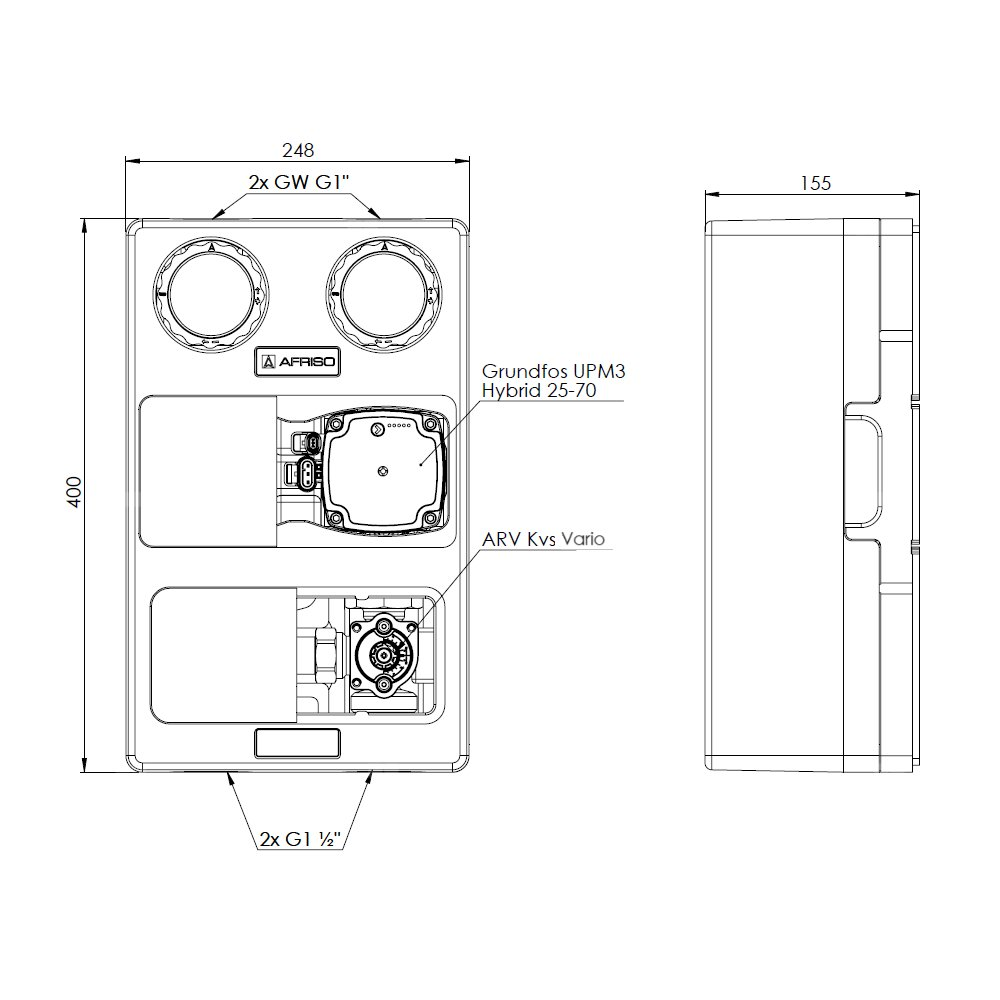 - Zainstalowany zawór mieszający ARV Kvs Vario z możliwością ustawienia Kvs w zakresie 2,5÷12 m³/h oraz pompa obiegowa Grundfos UPM3 Hybrid.