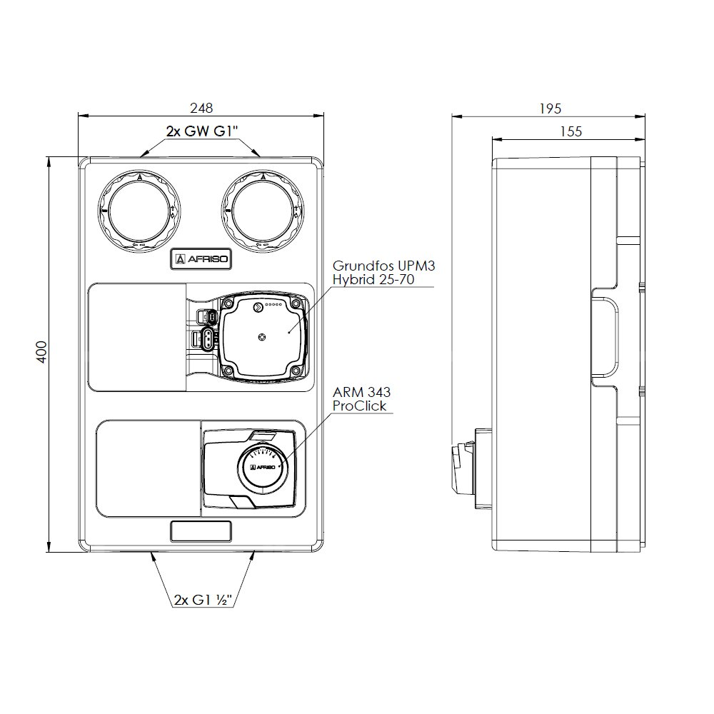 - Zainstalowany zawór mieszający ARV Kvs Vario z możliwością ustawienia Kvs w zakresie 2,5÷12 m³/h, pompa Grundfos UPM3 Hybrid oraz siłownik ARM 343 ProClick (3-pkt., 230 V, 120 s).