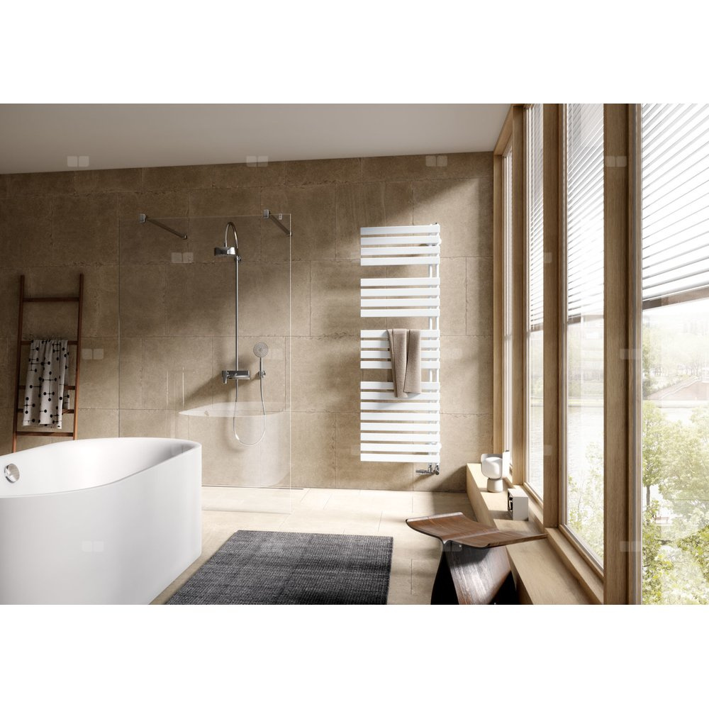 Asymetryczna forma i  rozmieszczenie płaskich prętów grzewczych w  blokach to cechy charakterystyczne Credo Half. Grzejnik jest z  jednej strony otwarty, co pozwala wygodnie zawieszać ręczniki. Grzejniki są dostępne w  wersjach prawej i  lewej. Opcjonalna półka z  drewna naturalnego stanowi elegancki, a  jednocześnie praktyczny akcent. Ciepła estetyka drewna w  ciekawy sposób kontrastuje ze stalowymi elementami grzejnika i  dodaje łazience przytulności.