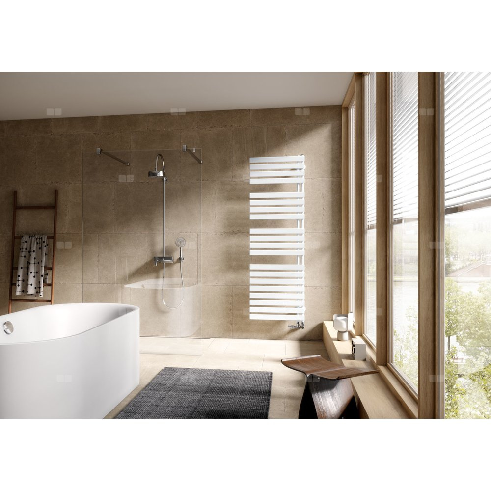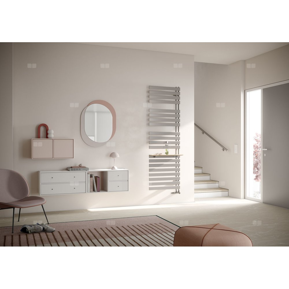Asymetryczna forma i  rozmieszczenie płaskich prętów grzewczych w  blokach to cechy charakterystyczne Credo Half. Grzejnik jest z  jednej strony otwarty, co pozwala wygodnie zawieszać ręczniki. Grzejniki są dostępne w  wersjach prawej i  lewej. Opcjonalna półka z  drewna naturalnego stanowi elegancki, a  jednocześnie praktyczny akcent. Ciepła estetyka drewna w  ciekawy sposób kontrastuje ze stalowymi elementami grzejnika i  dodaje łazience przytulności.