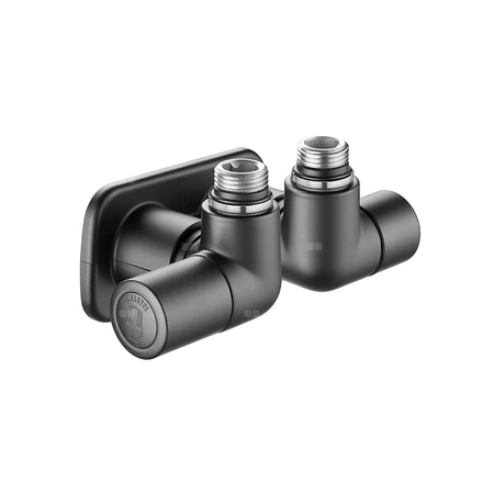 HIGH-STYLE para zaworów dekoracyjnych 3-osiowych. Przyłącze centralne Zestaw zawiera: - 3-osiowy zawór termostatyczny z pokrętłem przystosowany do montażu głowicy termostatycznej z serii 205; - 3-osiowy zawór odcinający; - dwie maskownice do montażu na ścianie, przyłącza: rozstaw otworów 50 mm. Przyłącze centralne. Wykonanie lewe. Do użycia ze złączkami z serii 437, 447, 681 i 679. podłącznie rury: G 1/2" A (ISO 228-1) GZ, wlot, lewy, Podłączenie do złączek Caleffi. podłączenie grzejnika: 23 p. 1,5, wylot, lewy. Maksymalne ciśnienie pracy: 10 bar. Zakres temperatury medium: 5–100 °C. Wykończenie: czarny (czarna, czarne). Kv zawór: 1,27 m³/h. Materiał: mosiądz.