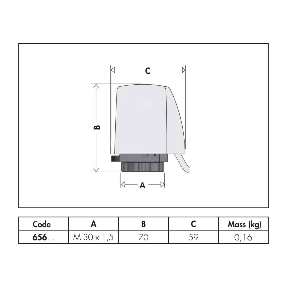 Siłownik termoelektryczny. Z mikroprzełącznikiem pomocniczym Ze wskaźnikiem pozycji otwarcia. Montaż przy użyciu szybkozłącza, z przyłączem wciskowym. Normalnie zamknięty. Do zaworów serii 338, 339, 401, 402, 425, 426, 421, 422, 455, 456, 220, 221, 222, 223, 224, 225, 226, 227, 230, 231, 232, 233, 234, 237, 676, 677, 678 i rozdzielaczy serii 670, 671, 668.S1,664, 665. Zakres temperatury otoczenia: 0–50 °C. Zasilanie elektryczne: 24 V (AC). Pobór mocy: 3 W. Stopień ochrony: IP 54. Długość przewodu zasilająego: 0,8 m. Styk mikroprzełącznika pomocniczego (230 V): 0,8 A. Prąd rozruchowy: ≤ 1 A.