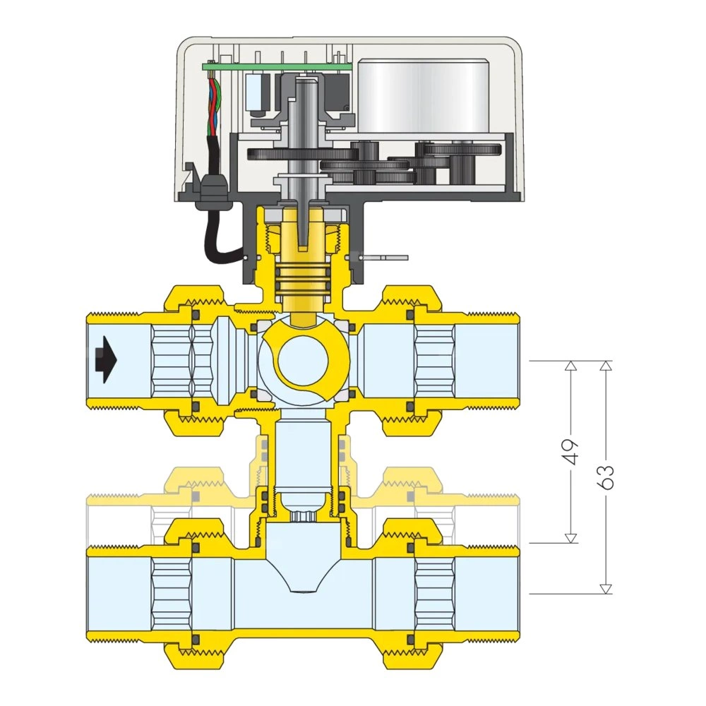 Trójdrożny zawór kulowy, z napędem z trójnikiem obejściowym Z mikroprzełącznikiem pomocniczym Z siłownikiem ze sterowaniem 3-punktowym Trójnik z dyszą U6. Regulowana odległość środkowych otworów wylotowych od 49 do 63 mm. Przyłącze: G 1/2" A (ISO 228-1) GZ. Maksymalne ciśnienie pracy: 10 bar. Zakres temperatury medium: -5–110 °C. Zakres temperatury otoczenia: 0–55 °C. Zasilanie elektryczne: 230 V (AC). Pobór mocy: 4 VA. Stopień ochrony: IP 44 (w pozycji pionowej), IP 40 (w pozycji poziomej). Długość przewodu zasilająego: 1 m. Styk mikroprzełącznika pomocniczego (230 V): 0,8 A. △p max.: 10 bar. Kv przelot: 10,3 m³/h. Kv obejście: 1,2 m³/h. Czas zadziałania: 40 s (obrót 90°).