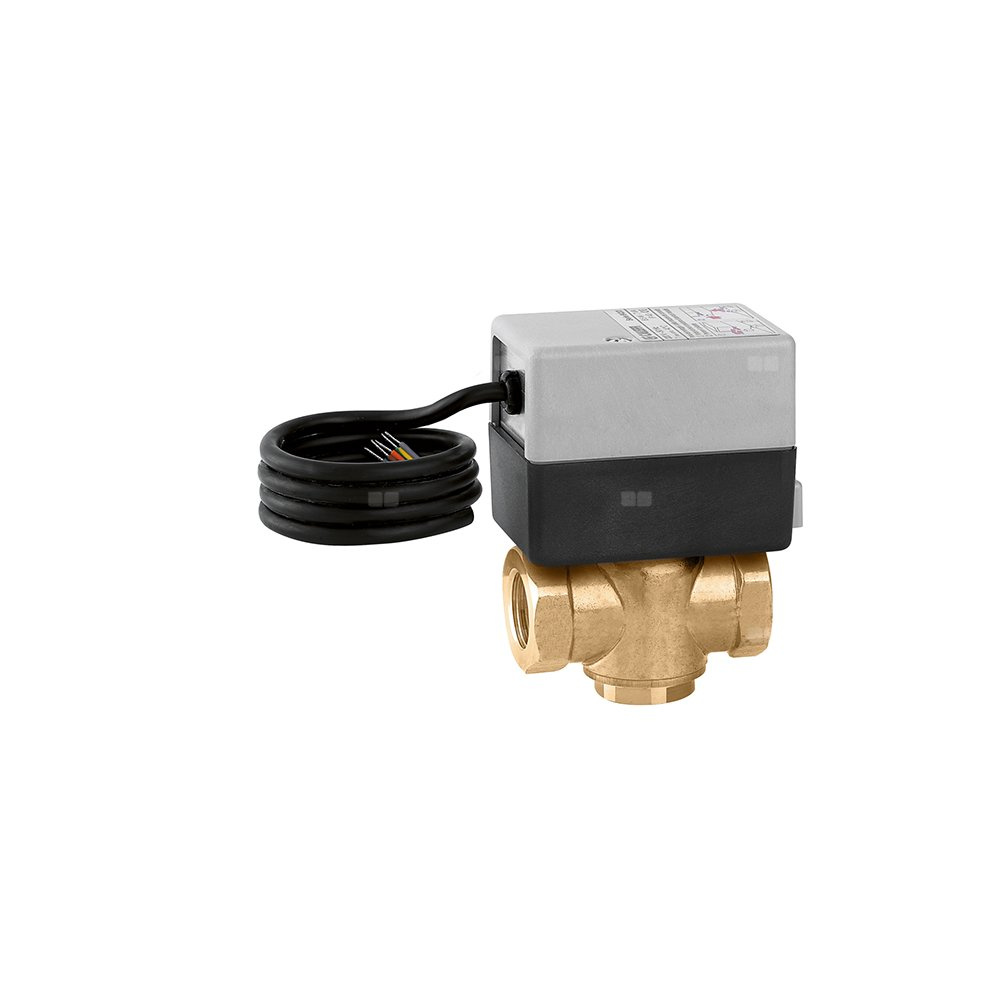 Trójdrożny zawór strefowy z napędem Z mikroprzełącznikiem pomocniczym Normalnie zamknięty. Przyłącze: G 1/2" (ISO 228-1) GW. Maksymalne ciśnienie pracy: 16 bar. Zakres temperatury medium: 0–90 °C. Zakres temperatury otoczenia: 0–40 °C. Zasilanie elektryczne: 230 V (AC). Pobór mocy: 7 VA. Stopień ochrony: IP 20. Długość przewodu zasilająego: 0,95 m. Styk mikroprzełącznika pomocniczego (230 V): 0,8 A. △p max.: 2,10 bar. Kv: 2,5 m³/h. Czas otwarcia: 70–75 s. Czas zamknięcia: 5–7 s.
