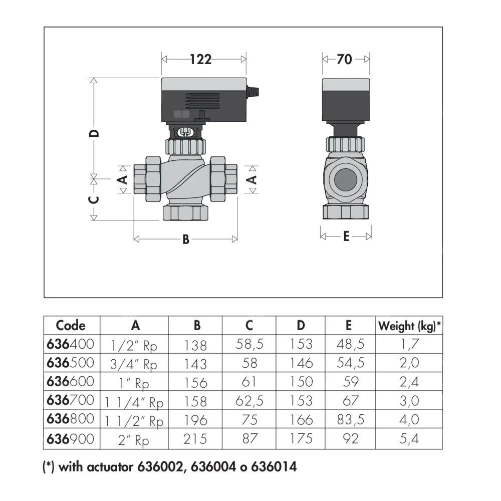 Dwudrożny zawór regulacyjny, gwintowany Charakterystyka stałoprocentowa. Przyłącze: Rp 1 1/2" (EN 10226-1) GW, złączka. Maksymalne ciśnienie pracy: 16 bar. Zakres temperatury medium: 0–100 °C. PN (Ciśnienie nominalne): PN 16. DN: DN 40 (korpus). Kv: 22 m³/h.