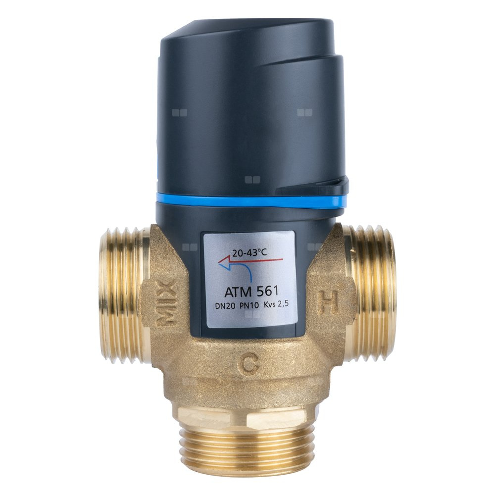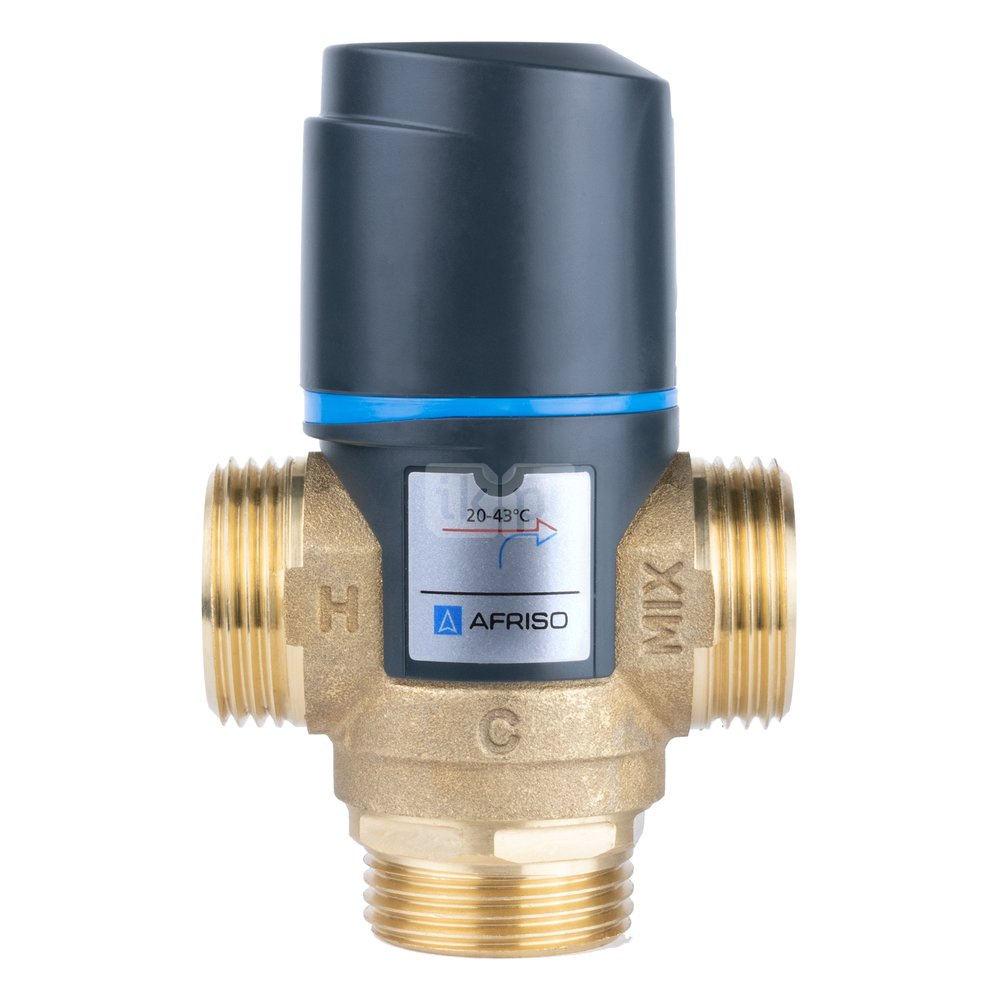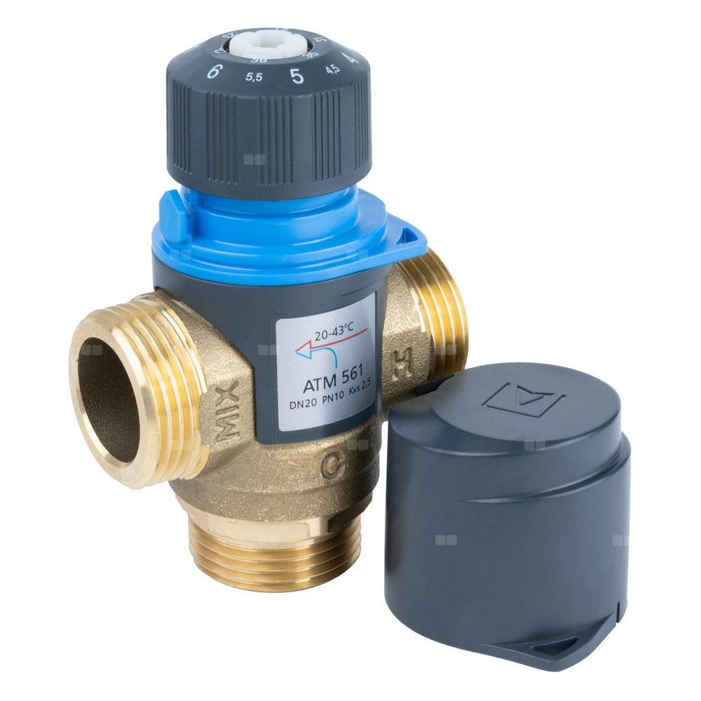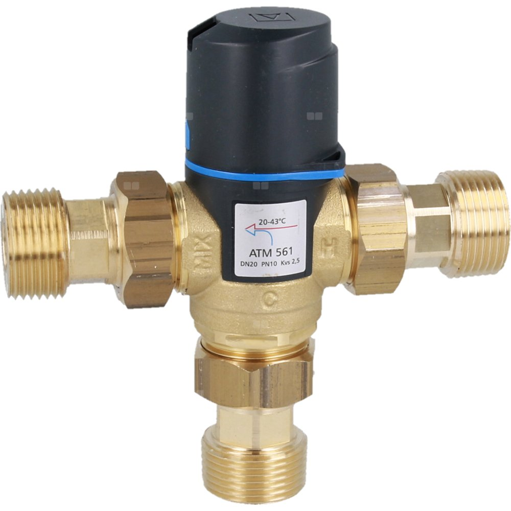 Zawór regulacyjny termostatyczny do wody ciepłej AFRISO ATM 561 ze śrubunkami mosiądz GZ 1'', DN 20, zakres temp. 20-43'C, Kvs 2.5 m3/h, maksymalna temperatura 90'C, maksymane ciśnienie 10 bar