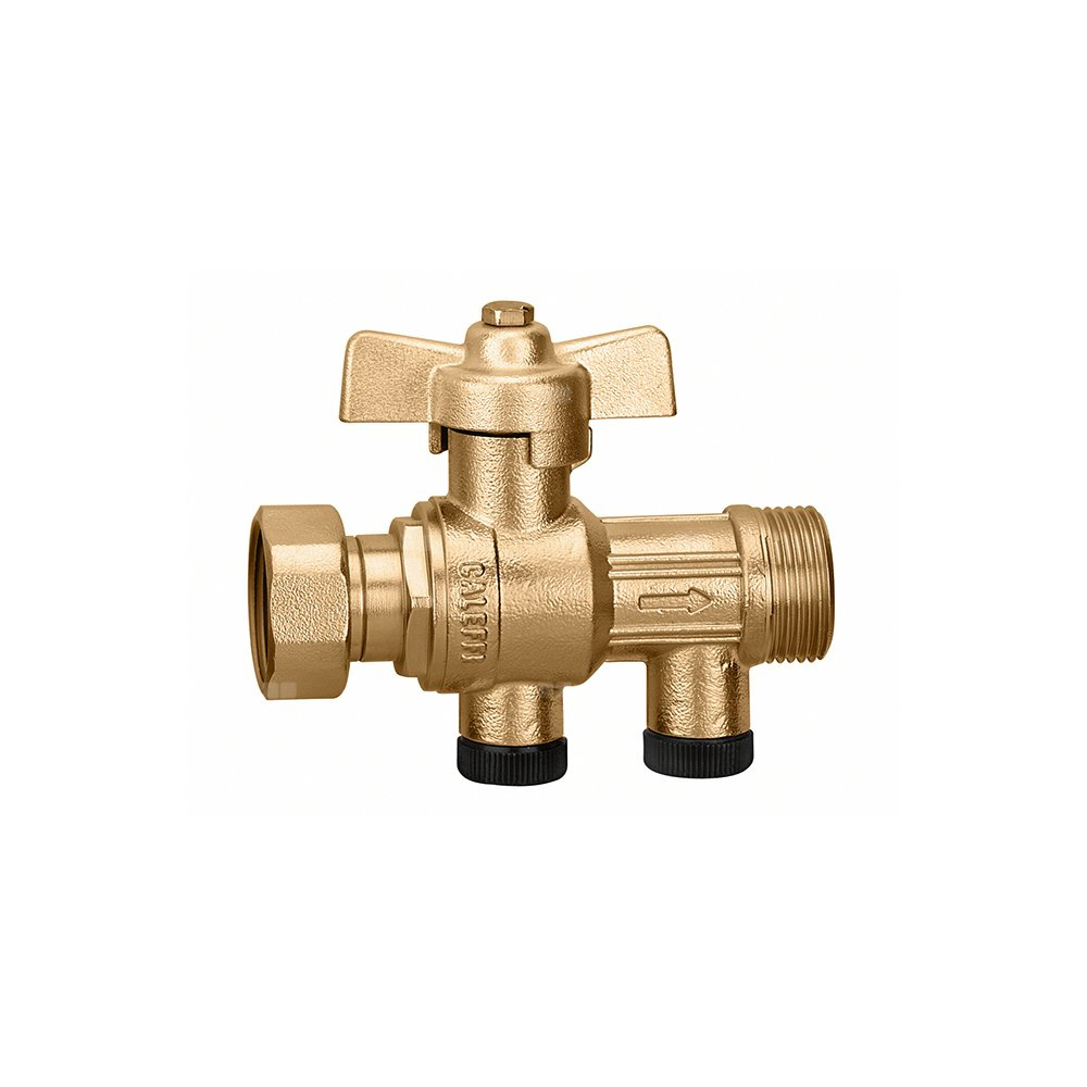 Zawór kulowy z wbudowanym, certyfikowanym zaworem zwrotnym. Z możliwością nadzoru. Nakrętka - przyłącza z gwintem zewnętrznym 3/