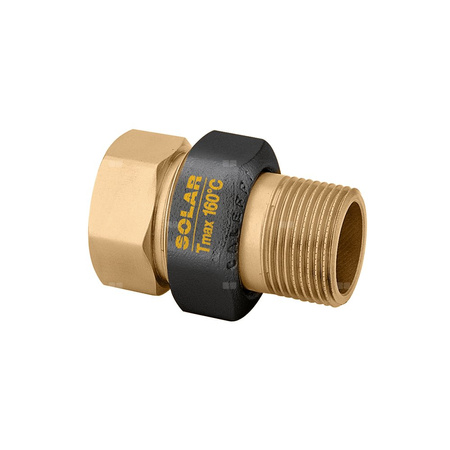 Złączka trzyczęściowa do systemów solarnych. Nakrętka niklowana, czarna. Przyłącze: G 1" (ISO 228-1) GW, wlot, złączka. Przyłącze: G 1" A (ISO 228-1) GZ, wylot, złączka. Maksymalne ciśnienie pracy: 16 bar. Zakres temperatury medium: -30–160 °C. Maksymalne stężenie glikolu: 50 %. Medium: woda, Roztwory glikolu.