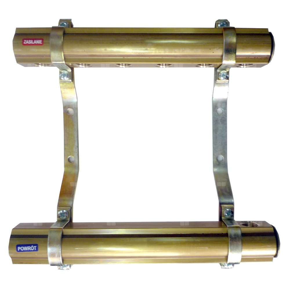 Rozdzielacz centralnego ogrzewania przeznaczony do rozdzielenia medium grzewczego na poszczególne grzejniki. Belki mosiężne profilowe z GW1" przyłącza 1/2" (sekcje). Wyposażenie: korek 1" - 2 szt., wieszak - 2szt..
