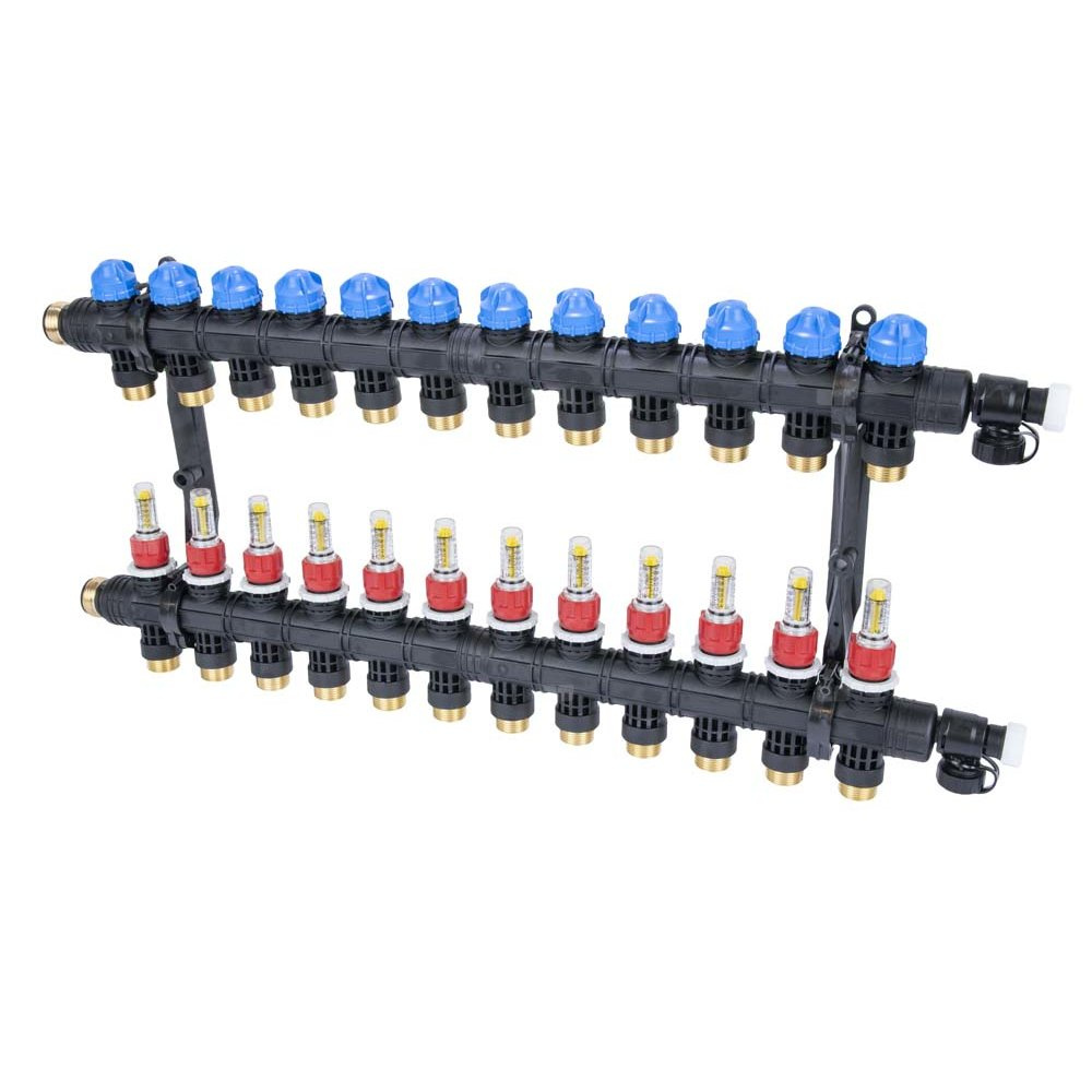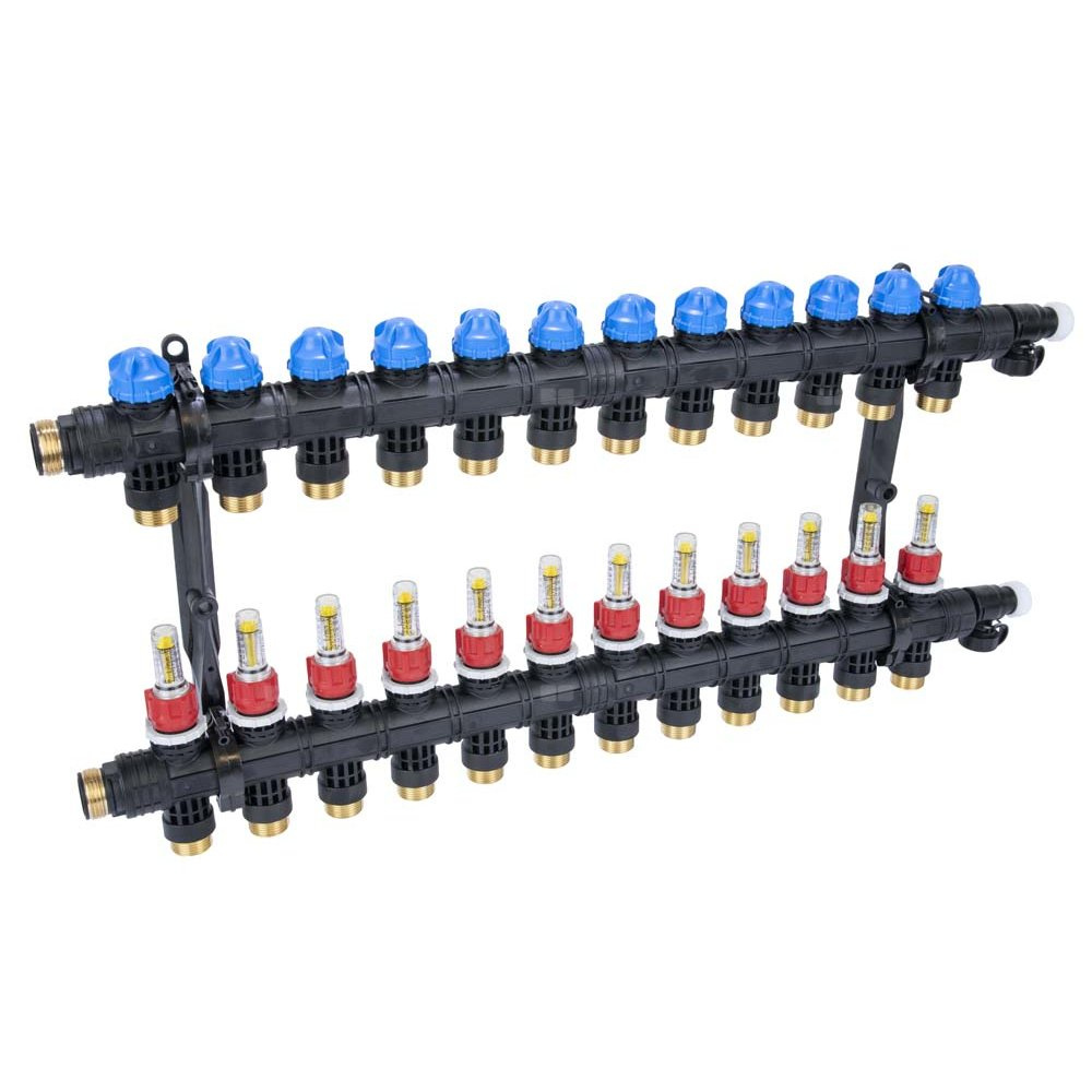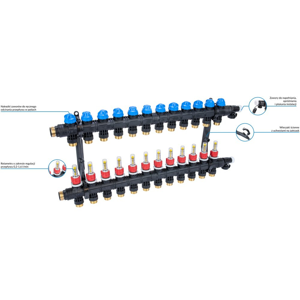 Rozdzielacz do ogrzewania podłogowego AFRISO ProCalida EF1 K 12-obieg. poliamid GZ 1'' x euroconus 3/4'' + przepływomierz + zawór napełn/spust