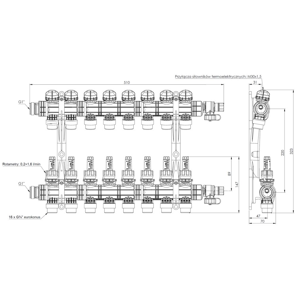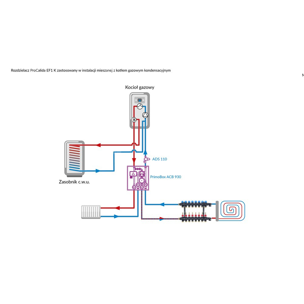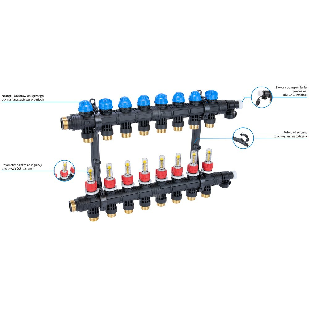 Rozprowadza ciepło / chłód ze źródła na poszczególne pętle instalacji płaszczyznowej.