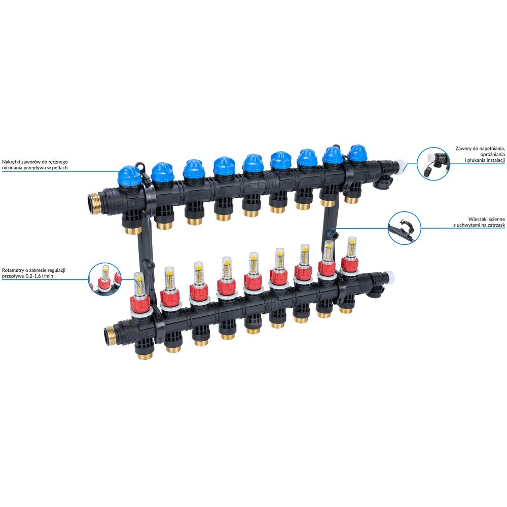 Rozdzielacz do ogrzewania podłogowego AFRISO ProCalida EF1 K 9-obieg. poliamid GZ 1'' x euroconus 3/4'' + przepływomierz + zawór napełn/spust