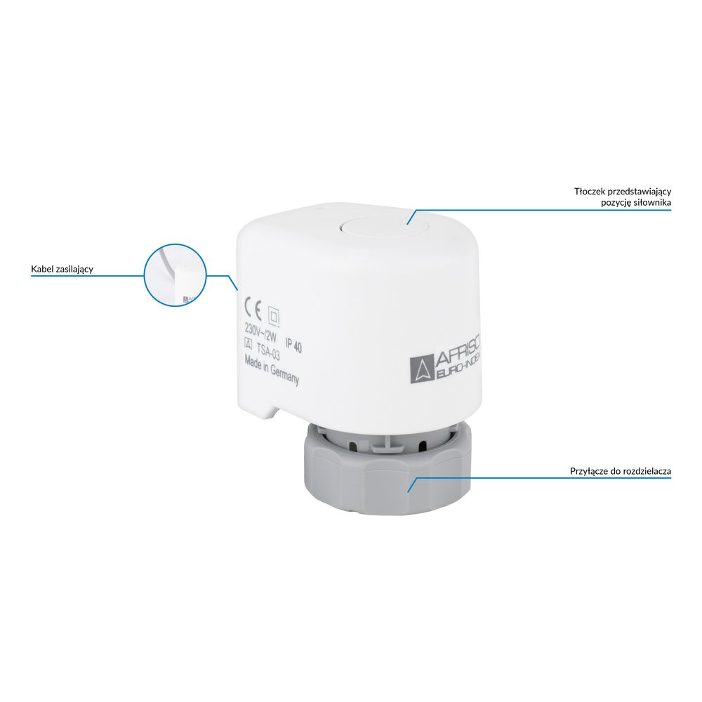 Siłownik termoelektryczny TSA-03, nakrętka M30 x 1,5 mm, 230 V AC z wył. pomocniczym, NC