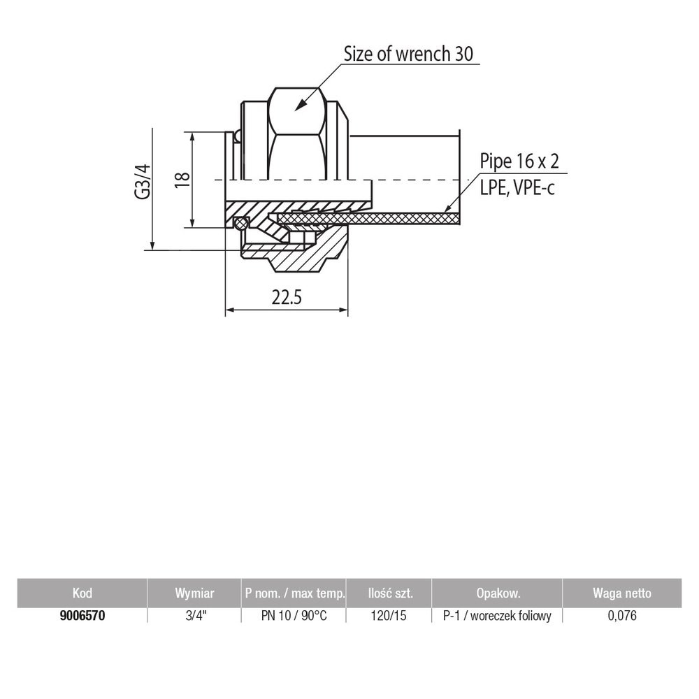 - Materiały: nakrętka, końcówka, pierścień: mosiądz;