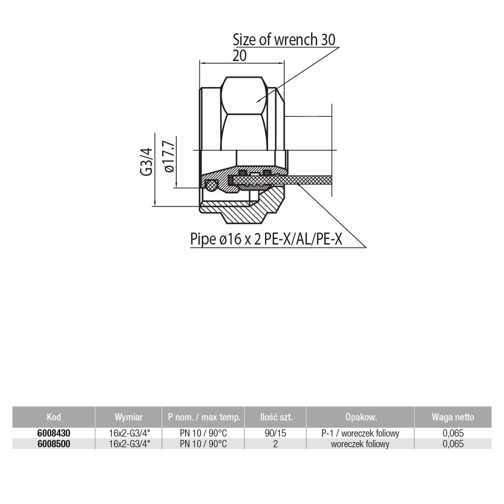 - Materiały: nakrętka, końcówka, pierścień: mosiądz;
