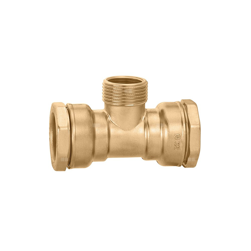 Trójnik redukcyjny z gwintem zewnętrznym-wewnętrznym Do rur polietylenowych. Przyłącze: G 1" A (ISO 228-1) GZ, Ø 32, wlot. Przyłącze: G 3/4" (ISO 228-1) GW, wylot. Maksymalne ciśnienie pracy: 16 bar. Zakres temperatury medium: 0–40 °C. Materiał: mosiądz.