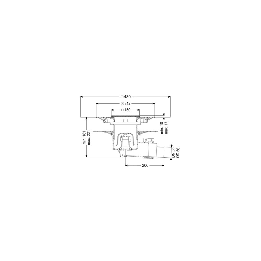 KESSEL Wpust obiektowy Ecoguss kołnier., wielkość nominalna (DN) 50, króciec boczny, odwodnienie przez odpływ punktowy, syfonem w zestawie, maks. wys. posadzki 17 mm, typ pokrywy Kratka szczelinowa, regulowany w trzech wymiarach