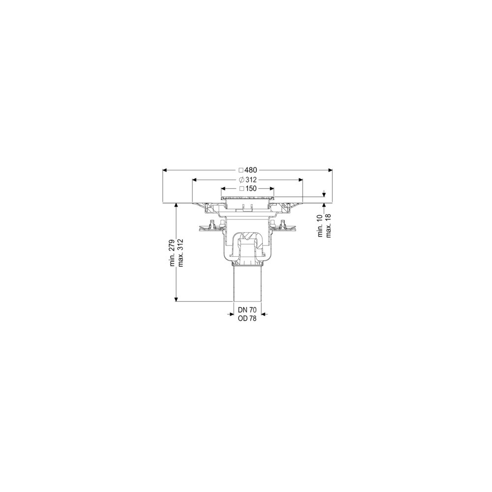 Wpust Ferrofix DN70, odpł.pion, z nasadką Variofix z ABS i kratką/ramą nierdz. 138x138, przeciwpośl., sys.125