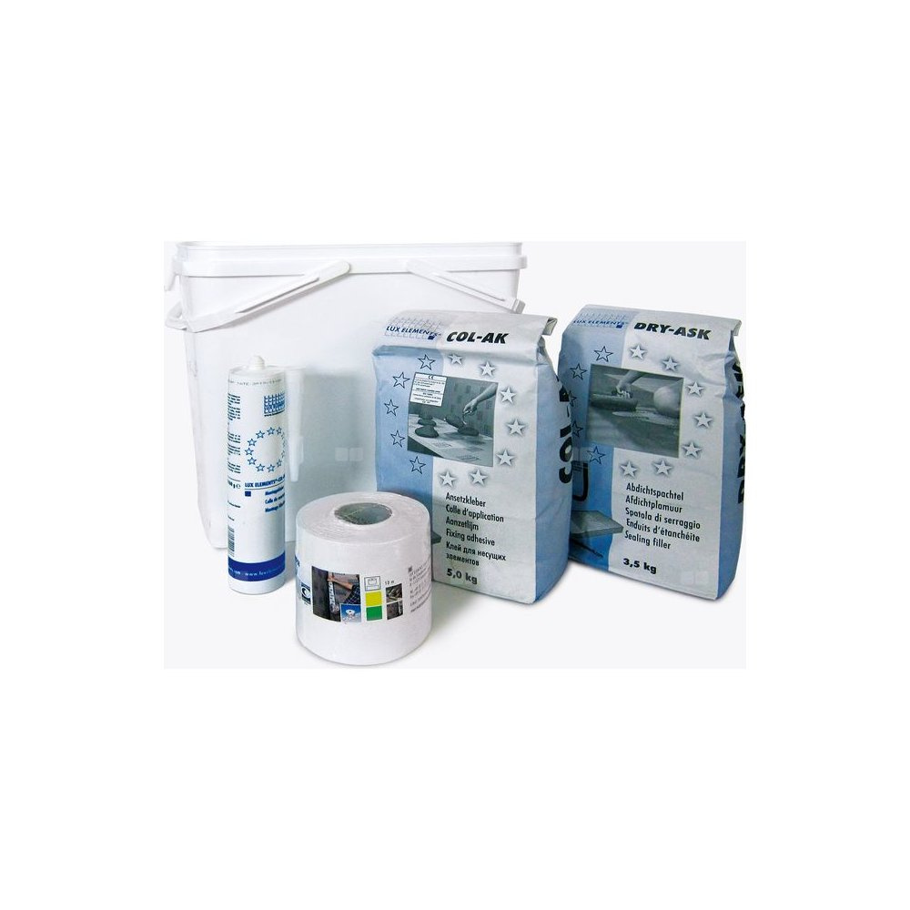 Zestaw uszczelniający do elementów płyty odpływu ściennego Scada, składający się z kleju i taśm uszczelniających