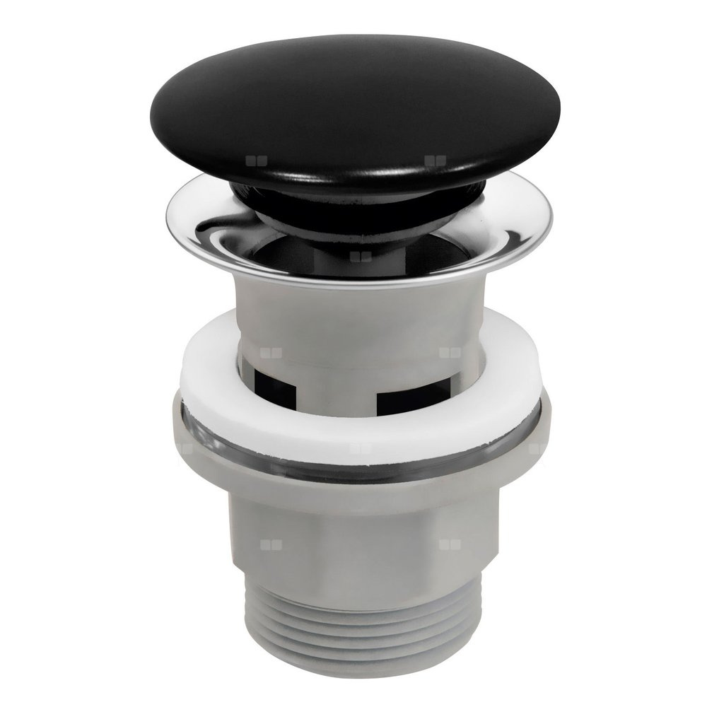 Czarny ceramiczny korek, trwały korpus wykonany z tworzywa, przeznaczony do umywalek z przelewem.