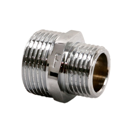 Nypel reducyjny wykonany z mosiądzu wysokogatunkowego CW617N. Powierzchnia chromowana. Maksymalna temperatura pracy 95°C. Maksymalne ciśnienie pracy 10 bar