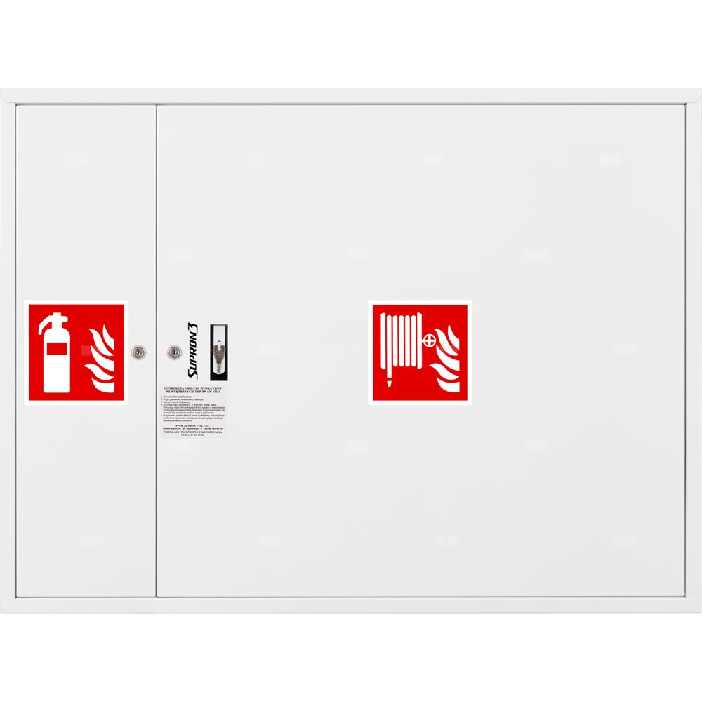 - szafka hydrantowa STANDARD wykonana z blachy czarnej malowanej farbą proszkową poliestrową fasadową typ Facade w kolorze czerwonym (RAL 3000) lub białym (RAL 9003), drzwi pełne; dzięki zastosowaniu zawiasu krytego drzwi szafki można otworzyć o 180°