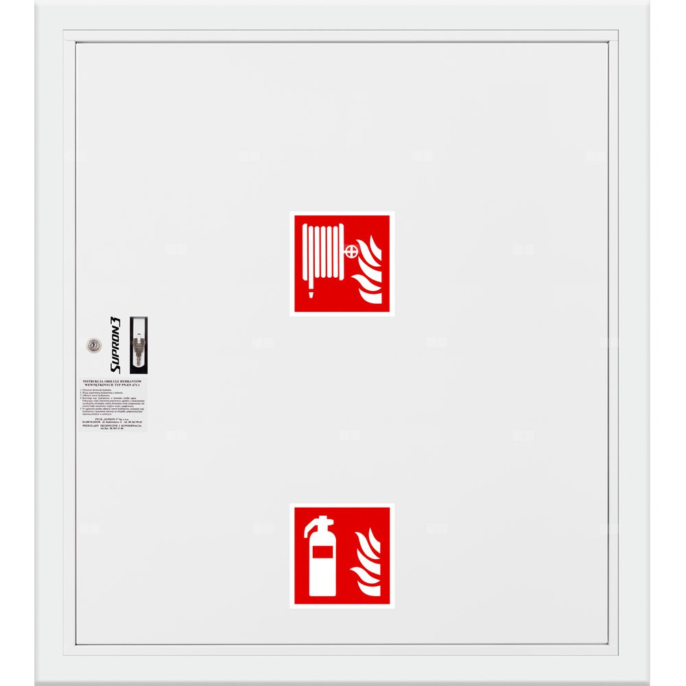 - szafka hydrantowa OCYNKOWANA wykonana z blachy stalowej ocynkowanej elektrolitycznie malowanej farbą proszkową poliestrową fasadową typu Facade w kolorze czerwonym (RAL 3000) lub białym (RAL 9003), drzwi pełne; dzięki zastosowaniu zawiasu krytego drzwi szafki można otworzyć o 180°