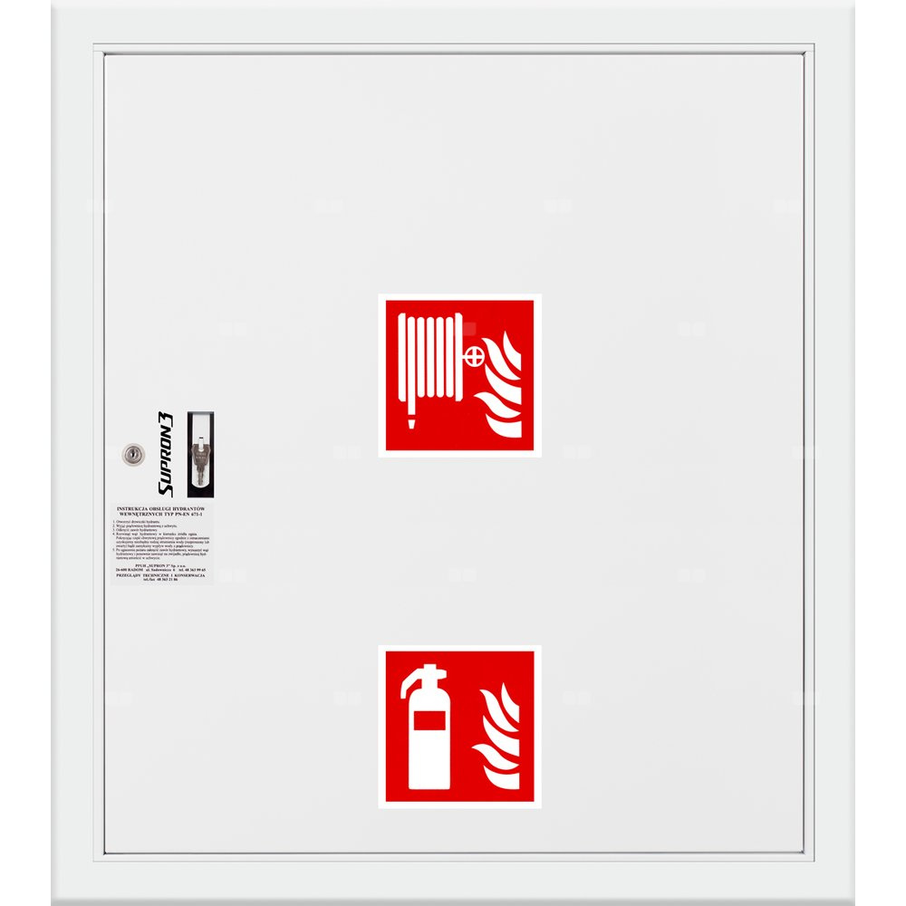 - szafka hydrantowa STANDARD wykonana z blachy czarnej malowanej farbą proszkową poliestrową fasadową typ Facade w kolorze czerwonym (RAL 3000) lub białym (RAL 9003), drzwi pełne; drzwi szafki można otworzyć o 180°