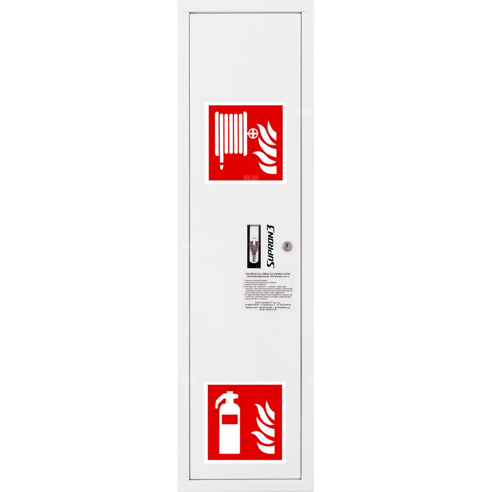 Hydrant DN 52 zawieszany boczny ze zwijadłem, z miejscem na gaśnicę, wąż 15 m, zamek patent, RAL 9003 lewy