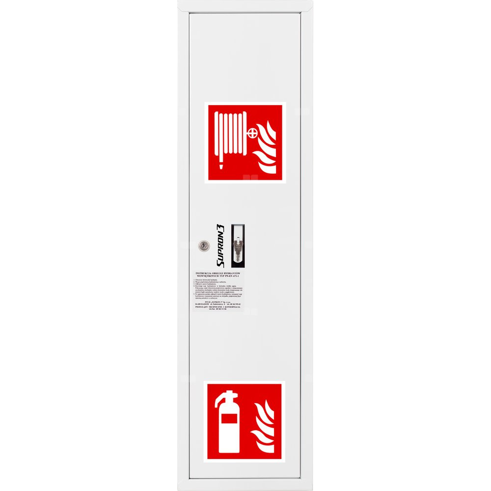 Hydrant DN 52 zawieszany boczny ze zwijadłem, z miejscem na gaśnicę, wąż 15 m, zamek patent, RAL 9003 prawy