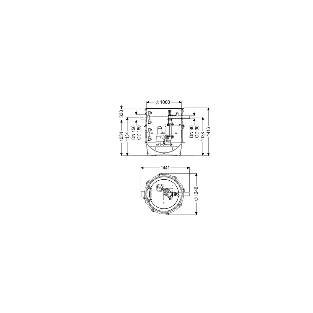 • Odstęp między dnem rury dopływowej a dnem zbiornika: 1054 mm