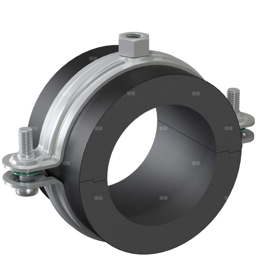Materiał: wkładka poliuretanowa o gęstości 80 kg/m3 otulony czarną akustyczną folią, na zewnątrz obejma stalowa ocynkowana z nakretką montażową