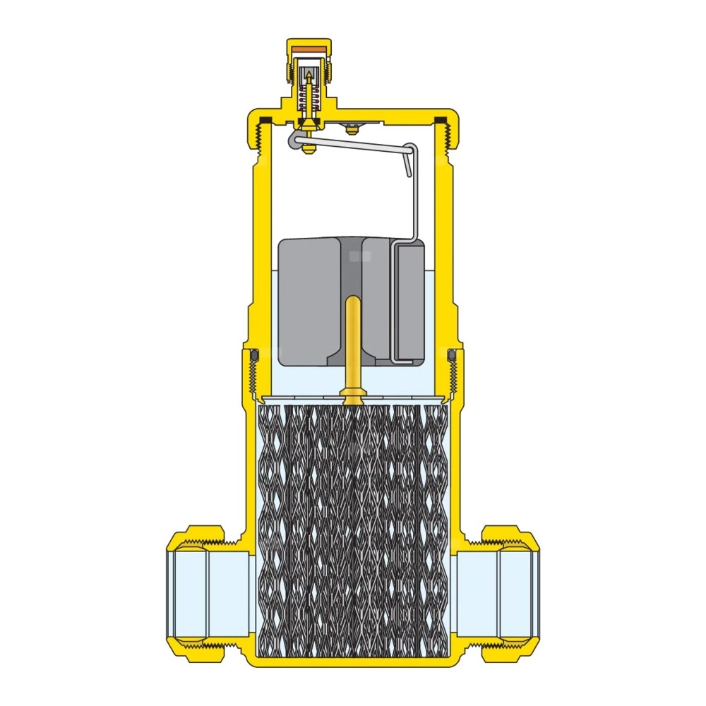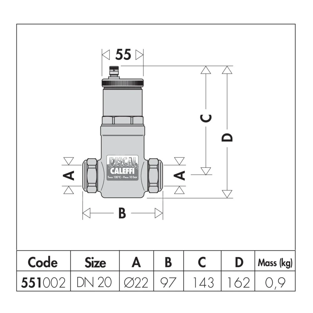Separator powietrza. Przyłącze: Ø 22, złączka zaciskowa. Maksymalne ciśnienie pracy: 10 bar. Maksymalne ciśnienie upustowe: 10 bar. Zakres temperatury medium: 0–110 °C. Materiał: mosiądz.