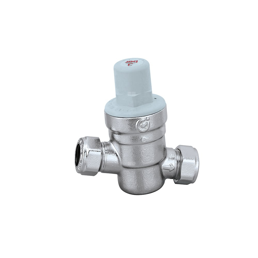 Regulator ciśnienia ze złączkami zaciskowymi – wersja skośna Wkład i filtr wymienny. Przyłącze: Ø 15. Maksymalne ciśnienie wlotowe: 16 bar. Zakres temperatury medium: 2–40 °C. Zakres regulowanego ciśnienia: 1–6 bar. Wykończenie: chromowane. Materiał: stop mosiądzu odporny na odcynkowanie.
