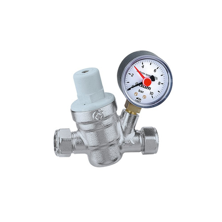 Regulator ciśnienia ze złączkami zaciskowymi – wersja skośna Wkład i filtr wymienny. Z manometrem: 0-10 bar. Przyłącze: Ø 22. Maksymalne ciśnienie wlotowe: 16 bar. Zakres temperatury medium: 2–40 °C. Zakres regulowanego ciśnienia: 1–6 bar. Wykończenie: chromowane. Materiał: stop mosiądzu odporny na odcynkowanie.
