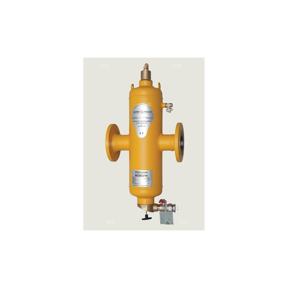 Separator powietrza i zanieczyszczeń SPIROCOMBI. Jest to urządzenie bezobsługowe, pracujące bez siatek i filtrów, zapewniające ciągłą separację powietrza (i gazów) oraz zanieczyszczeń stałych do najdrobniejszych cząstek, utrzymując instalację w stanie uzdatnienia. Wykonanie ze stali na rurociągi poziome DN50-DN300, połączenia kołnierzowe lub do wspawania.