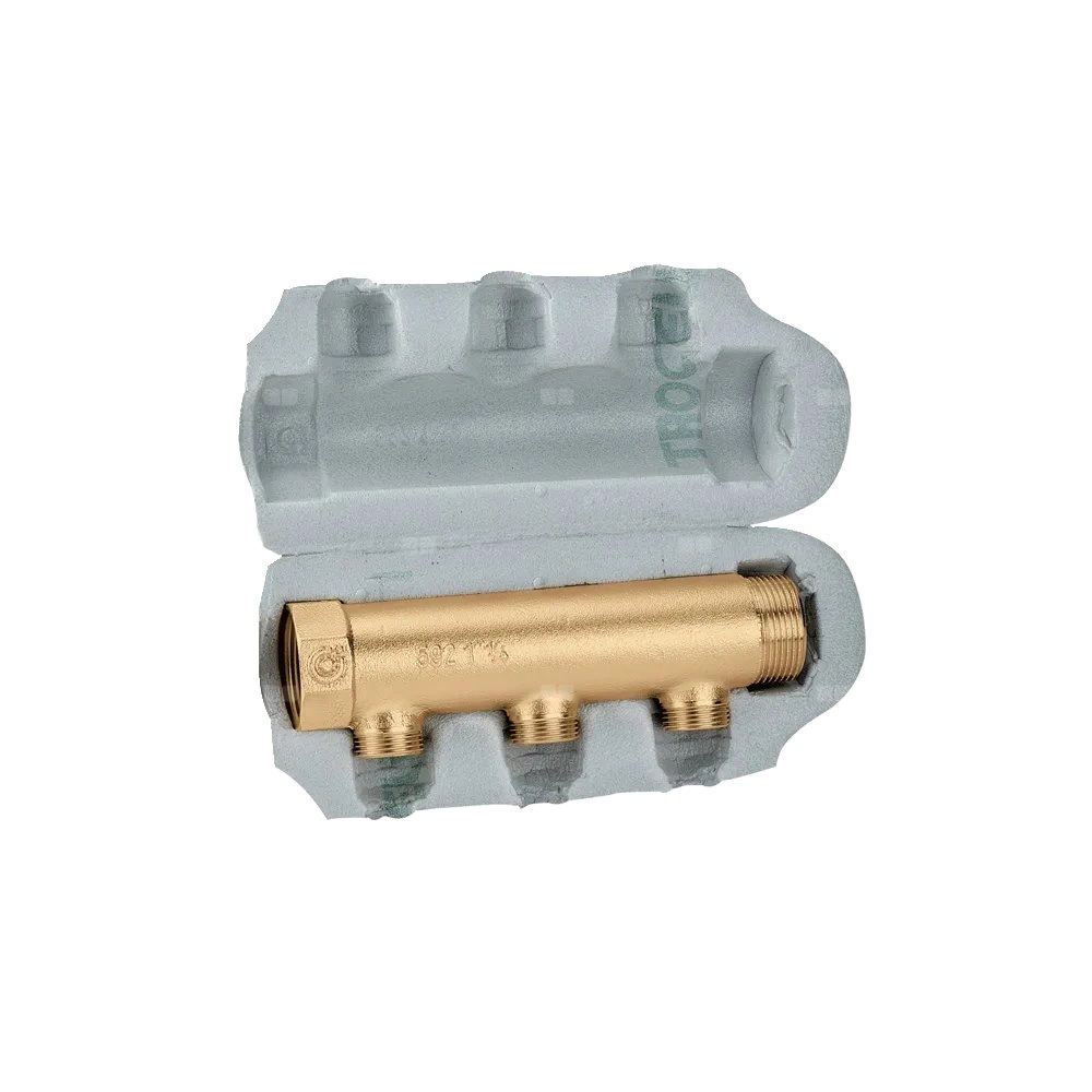 Pojedynczy rozdzielacz modułowy Z izolacją. Do instalacji klimatyzacyjnych. Przyłącze: G 1" (ISO 228-1) GW, wlot, Podłączenie do złączek Caleffi. Przyłącze: G 1" A (ISO 228-1) GZ, wylot. przyłącza wylot: G 3/4" A (ISO 228-1) GZ, 3 wyjścia. Maksymalne ciśnienie pracy: 10 bar. Zakres temperatury medium: -40–95 °C. Rozstaw wyjść: 60 mm.
